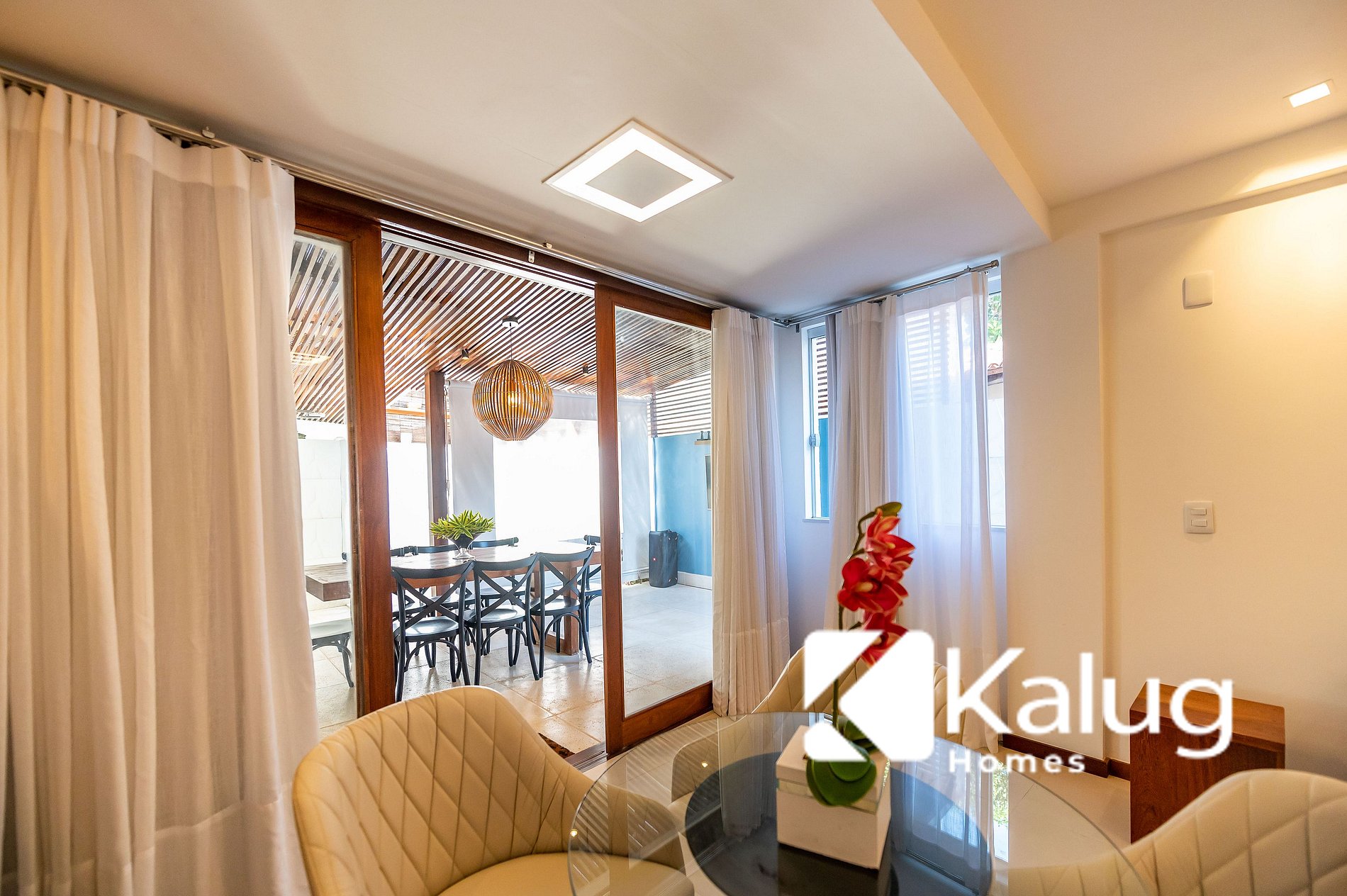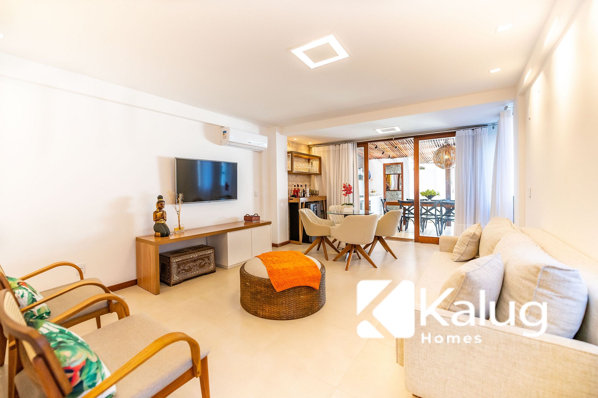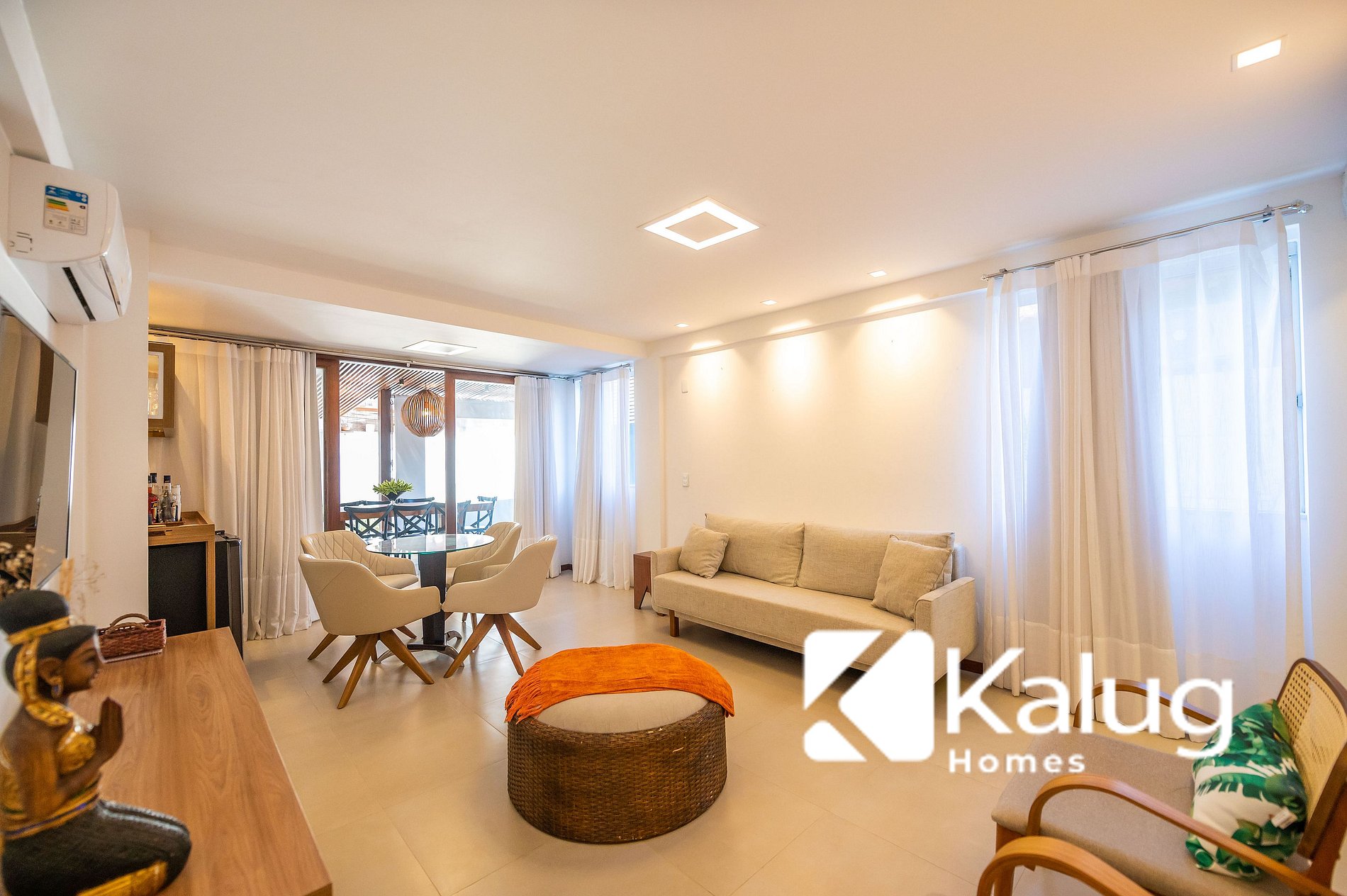 -> Sala de estar/jantar com sofá cama, ar condicionado, mesa de jantar, adega, cervejeira e smart Tv;