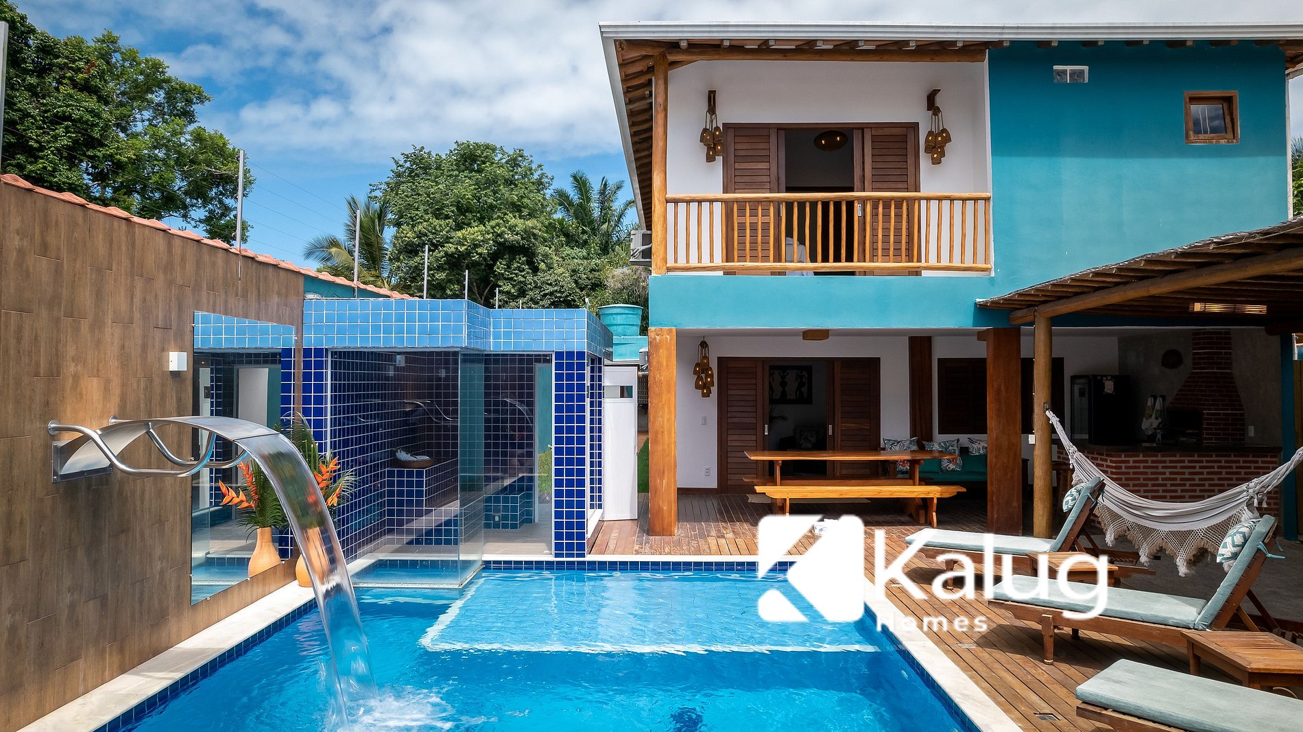 -> Receptivo com balcão gourmet, banquetas, churrasqueira, frezzer vertical, sofá, piscina com cascata, sauna, espreguiçadeiras e redes;