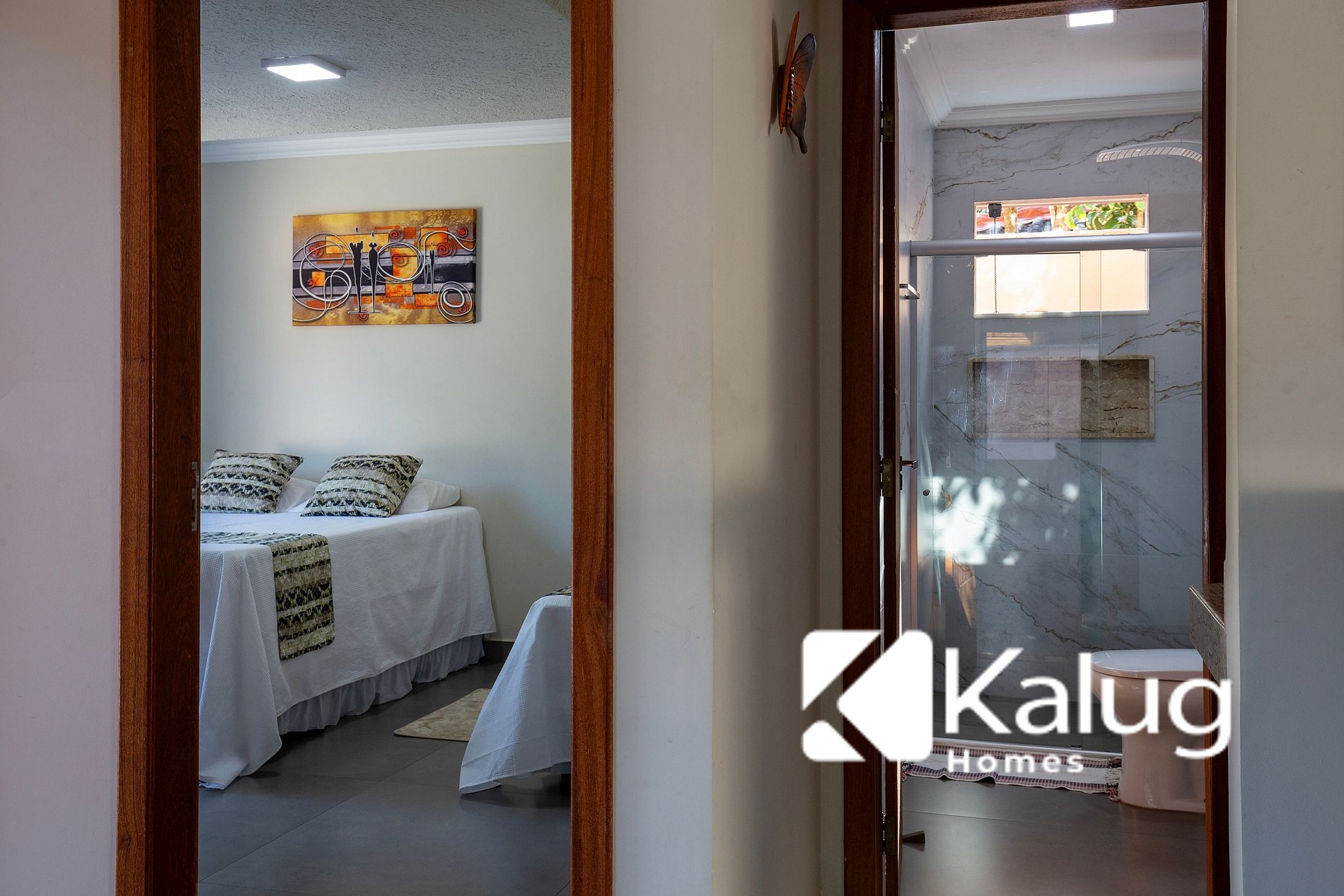 - Uma suíte master com uma cama de casal e uma de solteiro