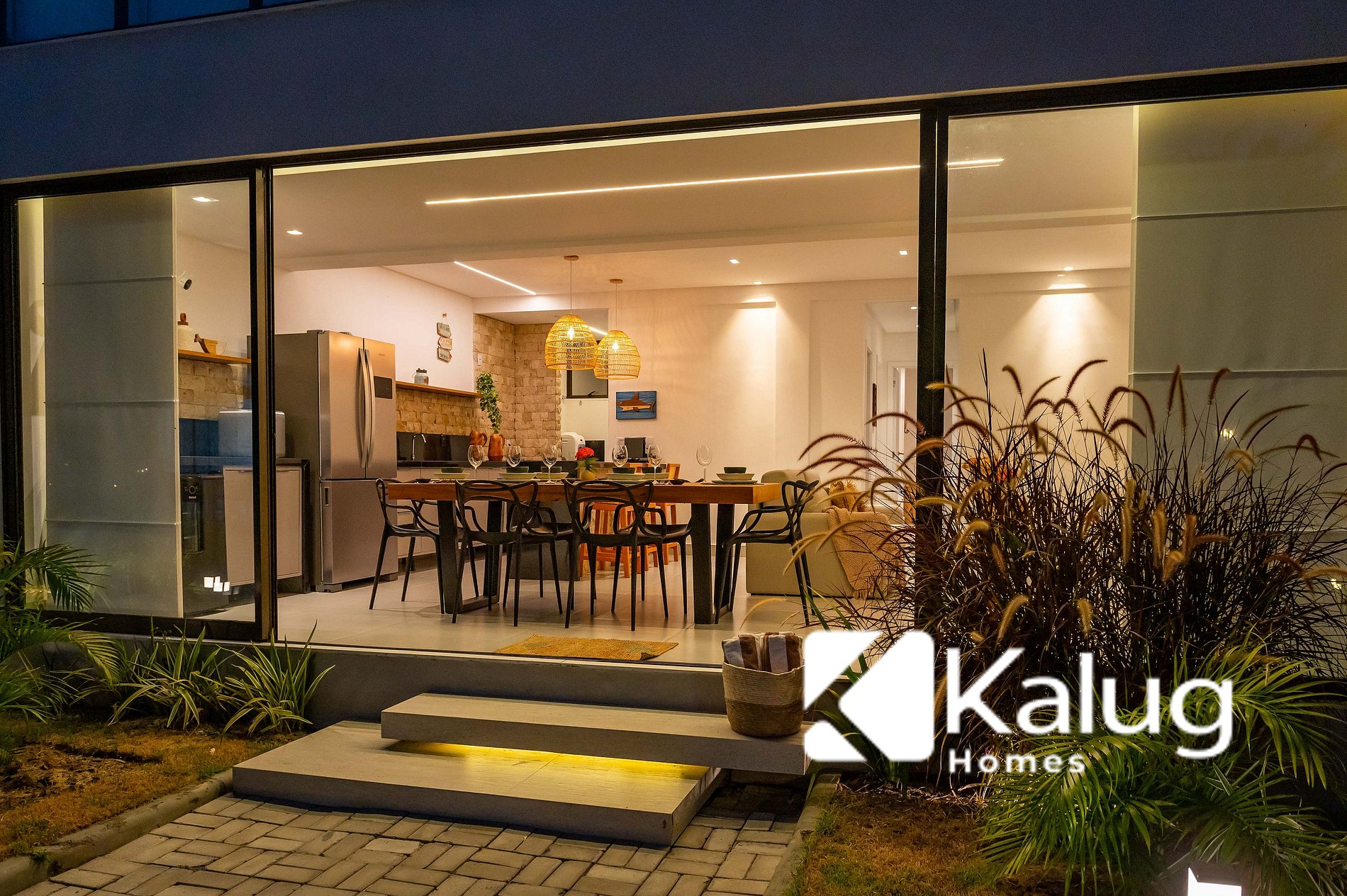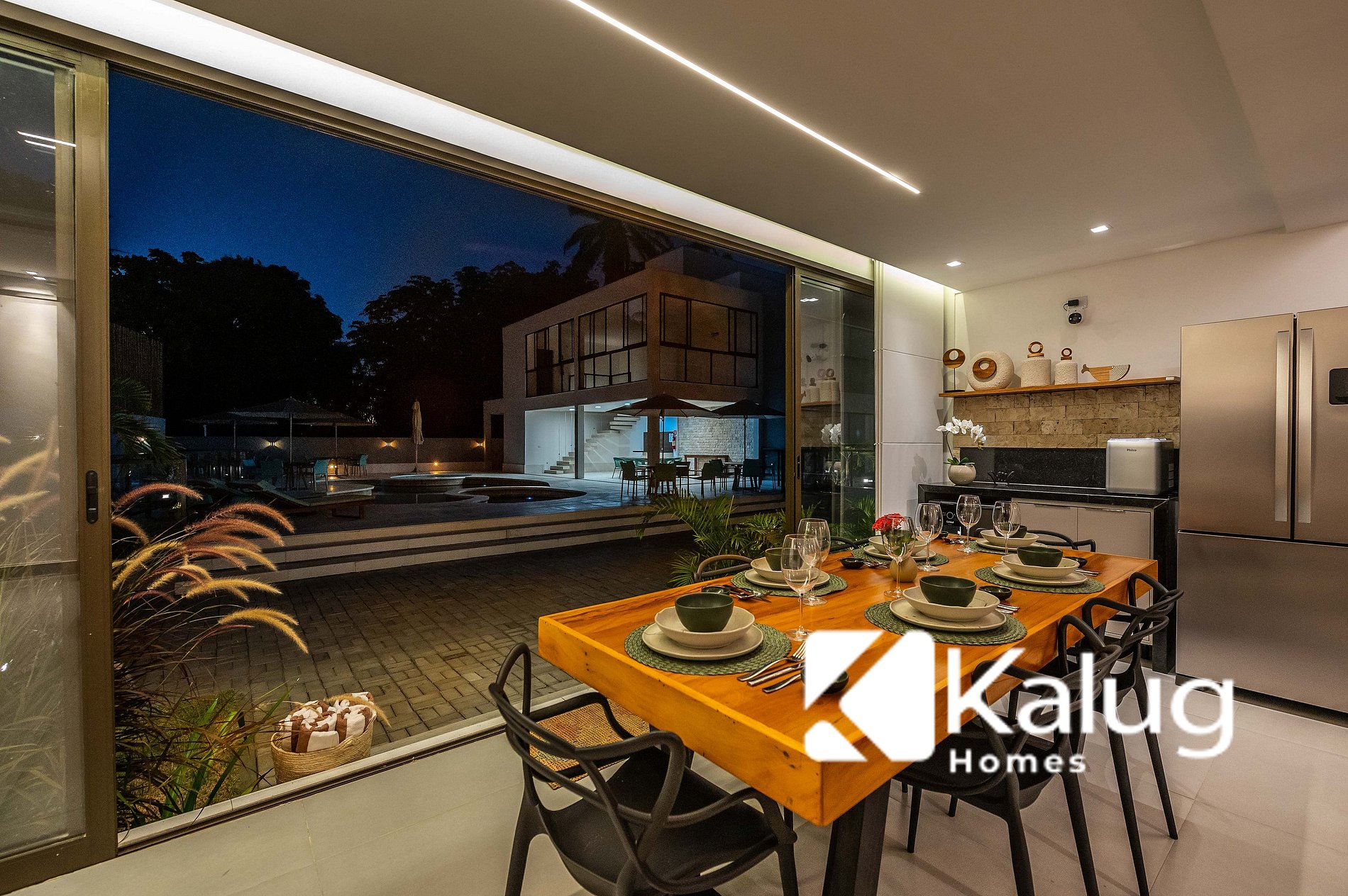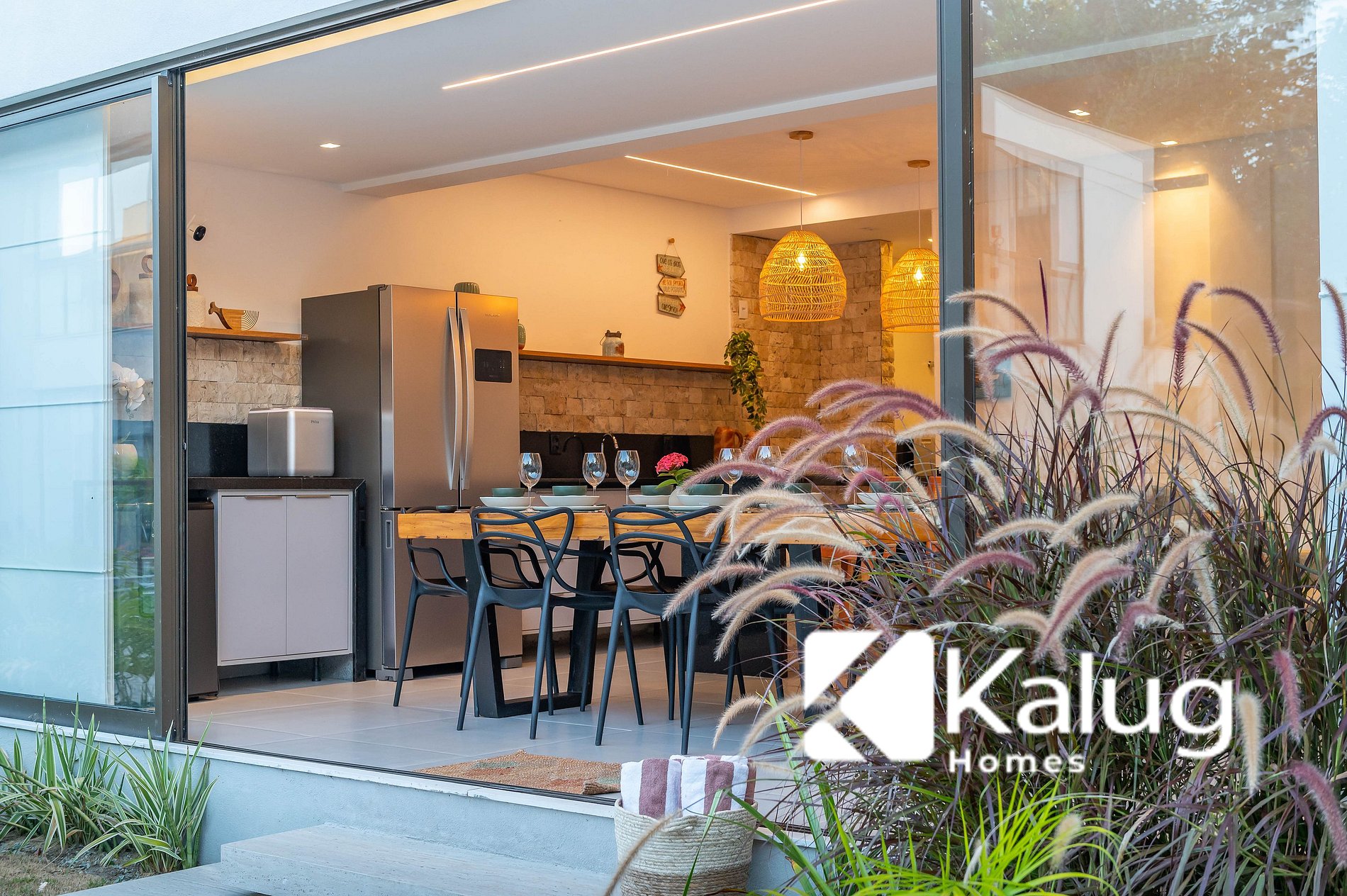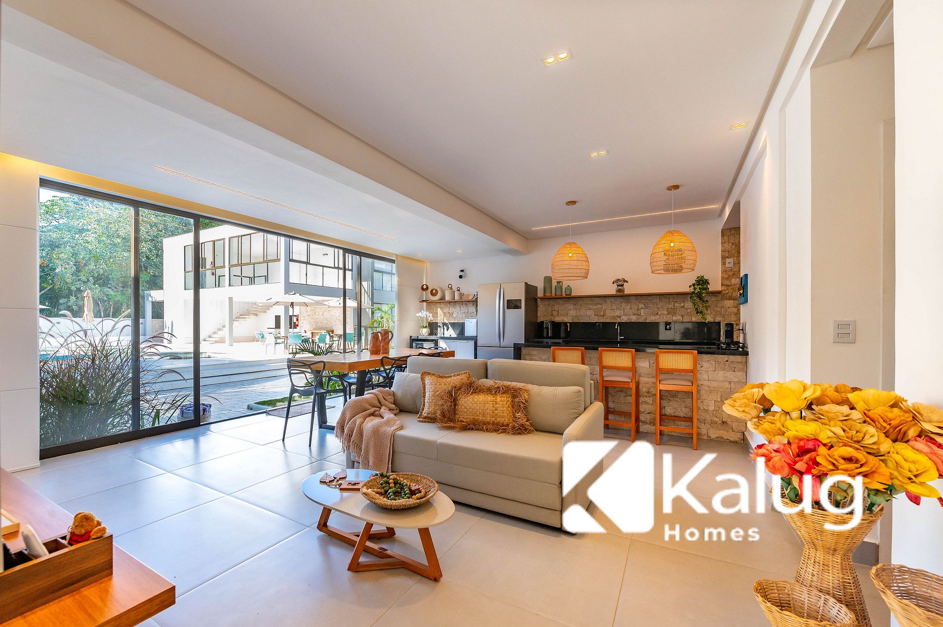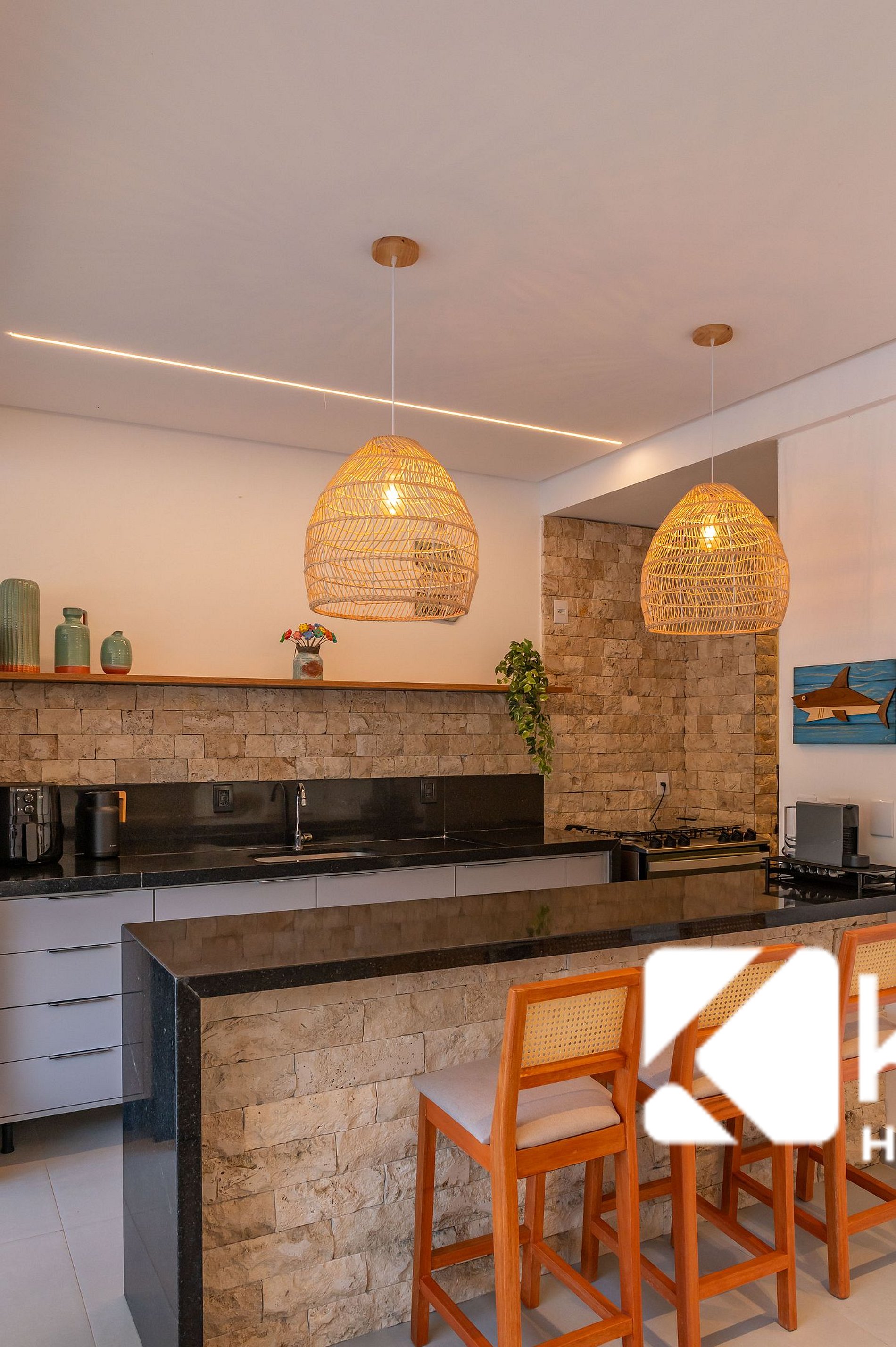 • Cozinha completa, com geladeira, fogão, cervejeira, máquina de gelo e utensílios diversos (talheres, copos e mais), garantindo praticidade durante toda a estadia.