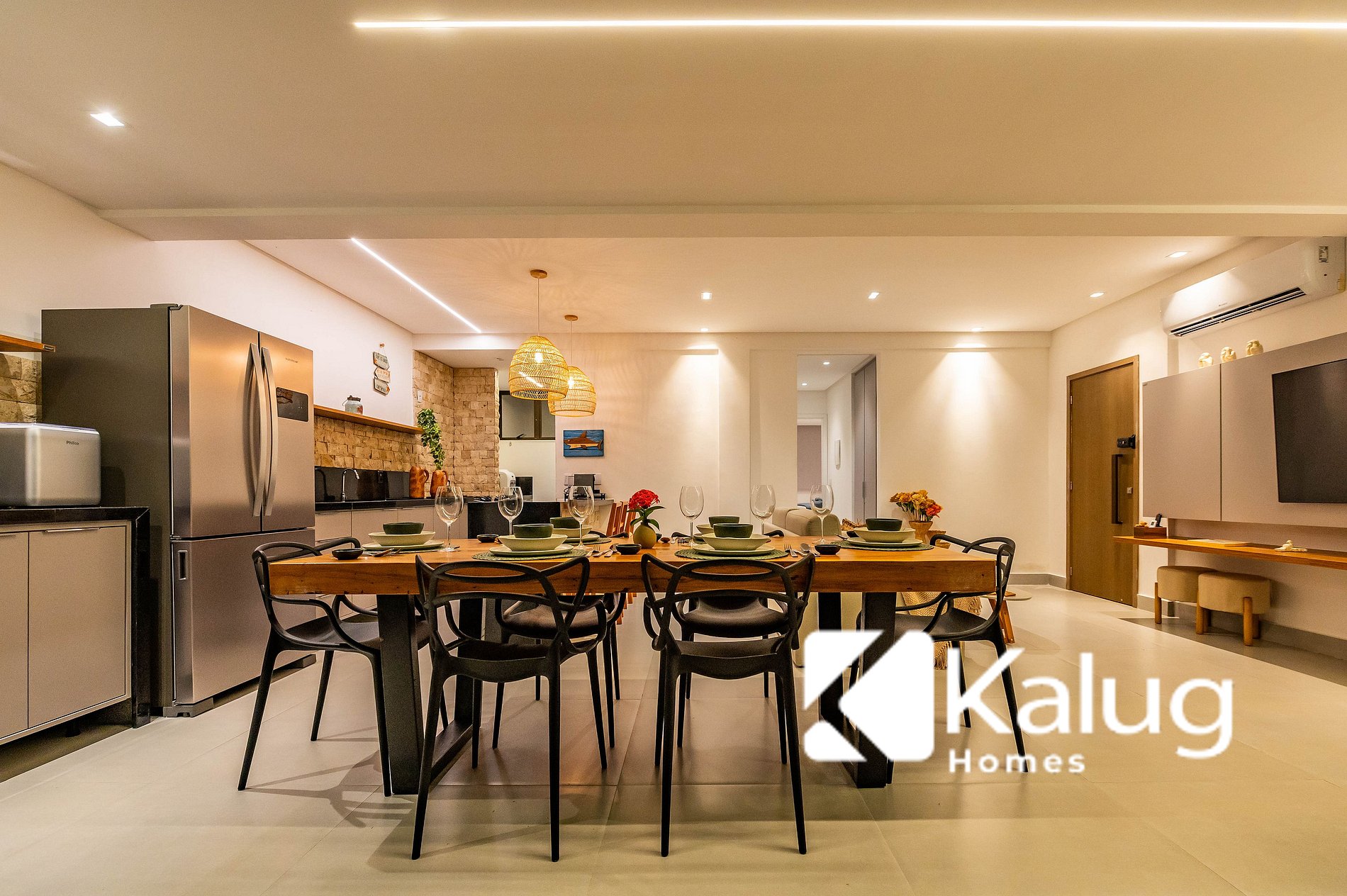 • Sala de estar e jantar integrada, com sofá-cama, ar-condicionado, mesa de jantar e Smart TV;